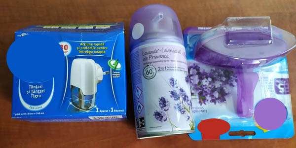 Aşa că am căutat alte soluţii. Am citit pe net, nişte articole în care nu prea am încredere, că tânţarii sunt deranjaţi de mirosul de lavandă aşa că am vrut să testez asta. Am mers într-un supermarket şi am cumpărat trei chestii în care mi-am pus toate speranţele că mă vor ajuta să îndepărtez ţânţarii: un odorizant de WC cu miros de lavandă, o rezervă cu miros de lavandă pentru odorizantul de aer automatic şi un aparat cu lichid pentru îndepărtarea ţânţarilor de la o firmă cunoscută, pe care l-am văzut întâmplător.